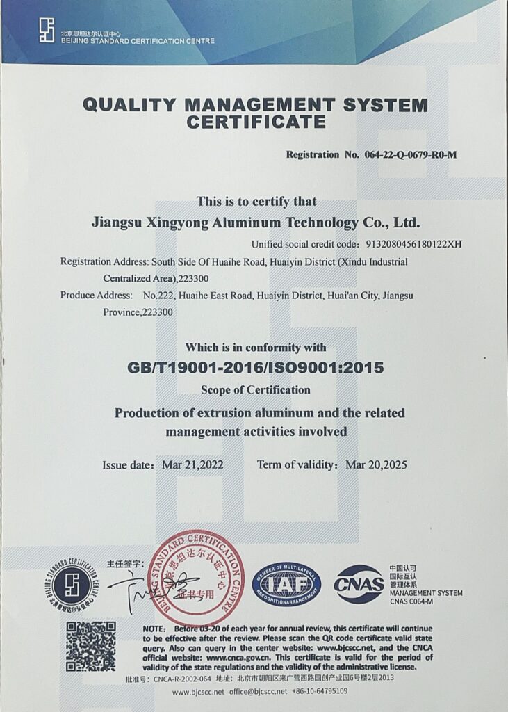 • 认证范围:铝挤压材生产及相关管理活动