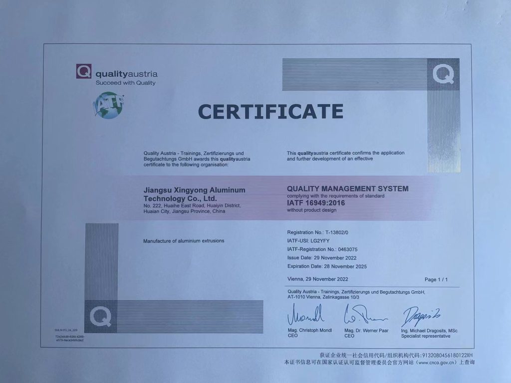 • 核心意义:此认证确保了从挤压、阳极氧化到组装的全流程质量管理具备稳定性和可追溯性。